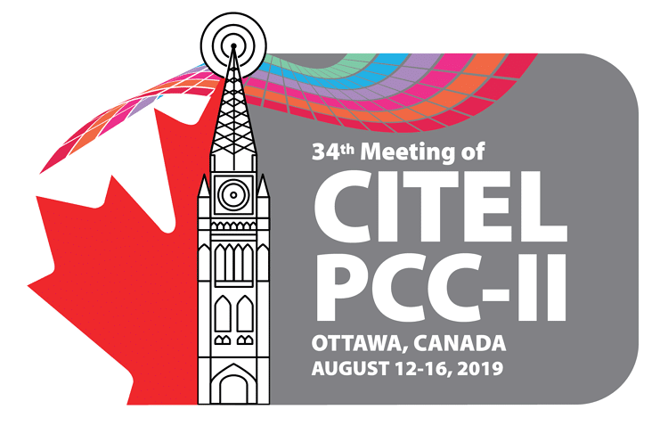 RABC-CCCR – Logo for the 34th Meeting of CITEL PCC-II in Ottawa, Canada, held August 12-16, 2019. Features a stylized tower, Canadian flag, and multicolored mosaic design on a gray background.